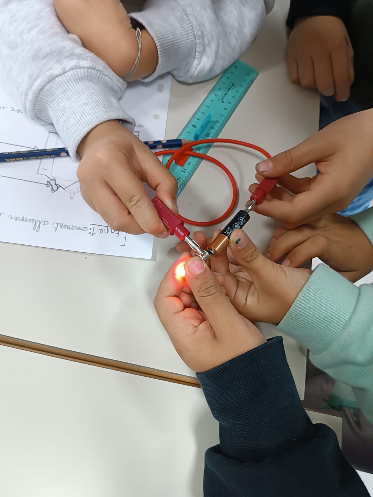 Durante questa sessione, i bambini hanno scoperto le condizioni necessarie per far funzionare una lampada: realizzare un circuito chiuso, identificare i conduttori e comprendere il ruolo della fonte di energia.